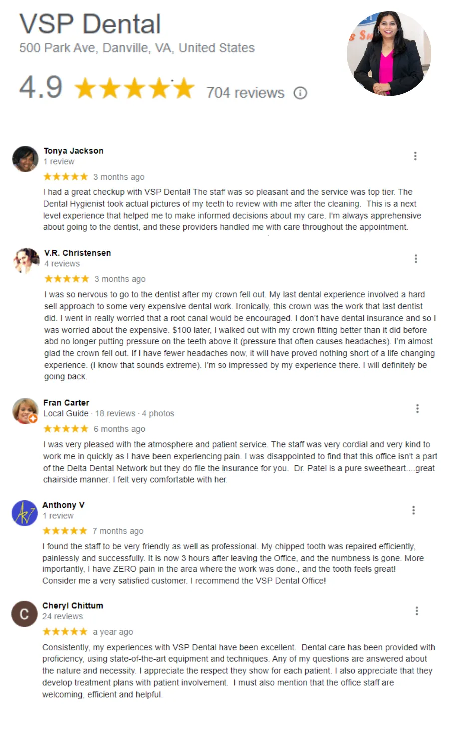Dr. Patel is the founding dentist of VSP Dental and is highly regarded as one of the top General, Cosmetic, and Implant Dentists in Virginia. Patients love the level of care she provides and travel statewide to be in her stewardship.
